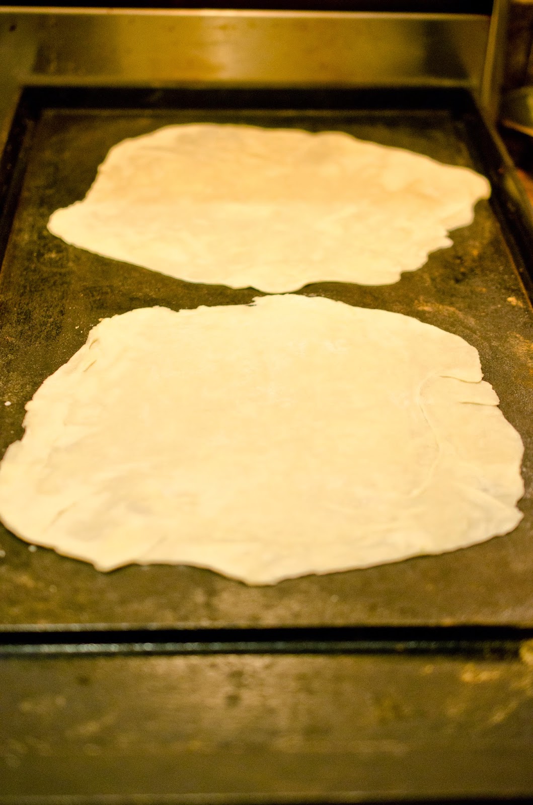 Dust counter with flour and roll out balls of dough with a small rolling pin. Turn quarter turn after each roll to roll out a round tortilla.